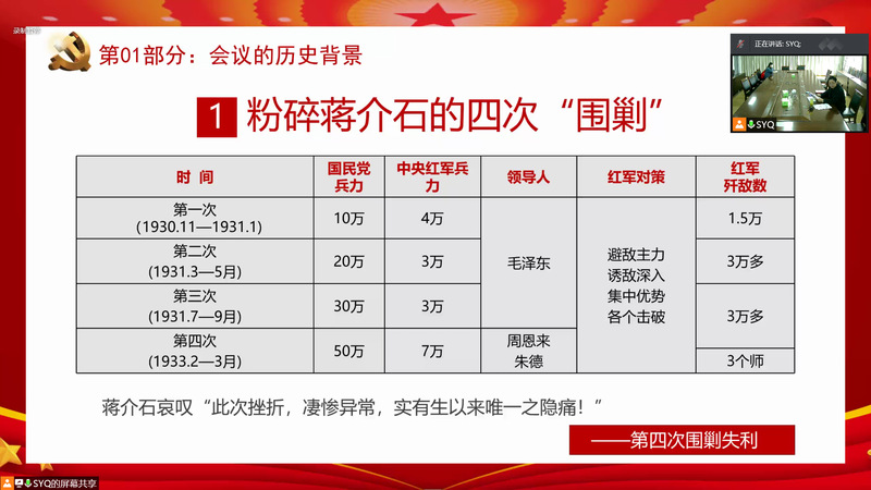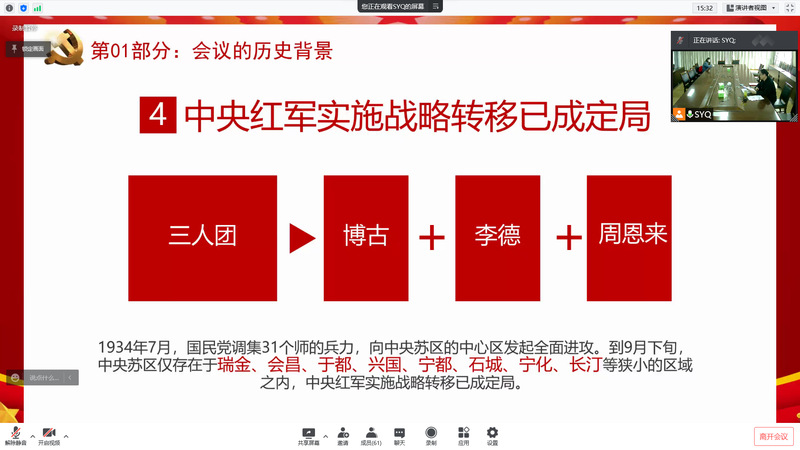 沈克非从遵义会议的历史背景、过程和决议内容、历史地位和精神内涵四个部分为全体学员再现了党历史上生死攸关的转折点--遵义会议的全部过程。随后,与会人员共同观看了遵义会议历史纪录片。