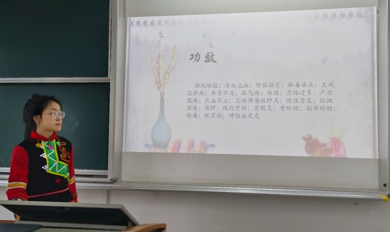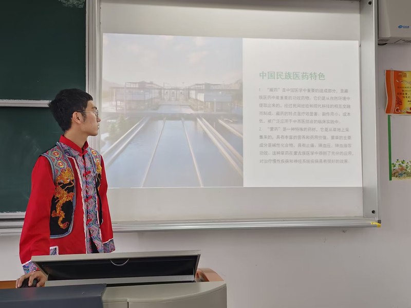 本次活动围绕主题“少数民族医药知识宣讲”展开,来自维吾尔族、彝族、藏族、蒙古族、侗族等民族的同学,身着民族服饰,介绍各自民族的传统医药知识。来自藏族的许晶晶同学介绍了当归、鸡血藤等有藏族地域特色的药材及藏医药浴、藏熏等民族特色疗法。来自彝族的杨雪琴同学阐述了彝族被称为“火”的民族的缘由,并着重介绍了彝族具有代表性的“酒火疗法”在温通经络、杀寒止痛、运行气血、善行药性等方面的功效。其他同学也分别介绍了维吾尔族“火、气、水、土”医学理论,蒙医“三根学说”等具有民族特色的医药理论。