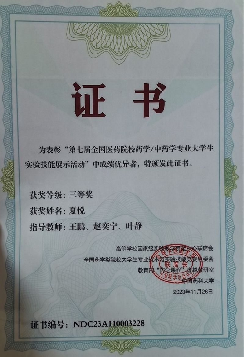 公司云顶国际8588yd组队参赛,由王鹏教师、赵奕宁教师和叶静教师共同指导。现场比赛分为实验理论和实验操作两个部分,理论部分主要考核药物化学、药物分析、药理学、药剂学、微生物学与生化药学等药学专业基础知识,实验操作主要考查药学综合实验操作技能。经过近6小时的激烈角逐,云顶国际8588yd2021级本科生夏悦喜获三等奖,向评委们展示了盐师学子扎实的药学理论功底和熟练的实验操作技能。