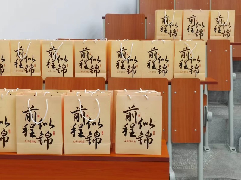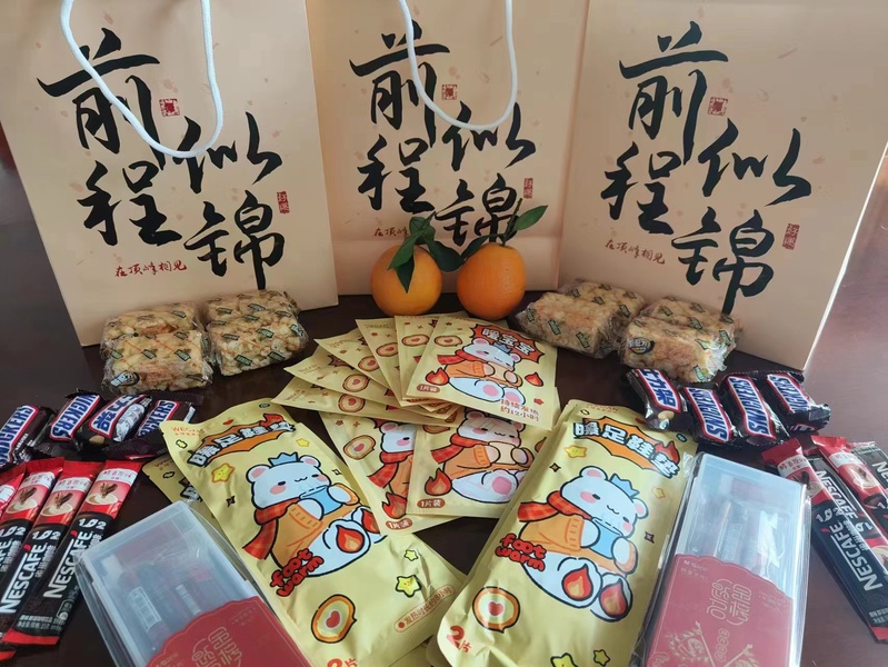 会后,公司领导老师与考研学子亲切交流,并为同学们发放考研加油包,为同学们添动力、送祝福。礼包中既有考试所必须的文具,也有士力架、咖啡等能量食品,还有寓意“马到成功”的萨其玛、橙子组合,蕴含着公司对考研学子“前程似锦 顶峰相见”的关怀与祝福。