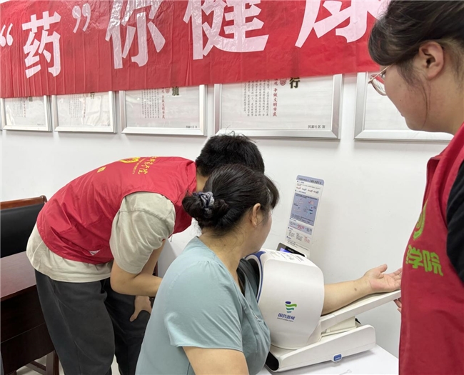 宣讲结束,实践团成员为社区居民免费测量血压,利用专业知识,耐心解答居民们关于血压的疑问,并根据测量结果给出健康建议,提醒居民们增强自我保健意识。炎炎夏日,实践团成员还为参加活动的居民分发精心准备的中药香囊和乌梅饮。