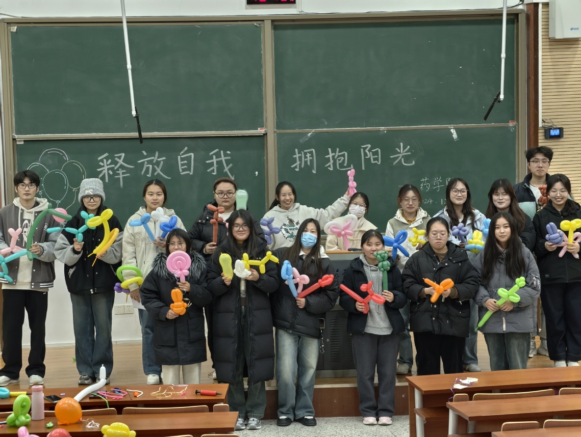 在“吹走忧愁”环节,同学们将写好的便签放入彩色气球,充气后扎紧,象征性地将忧愁“吹走”,现场洋溢着轻松愉快的氛围。